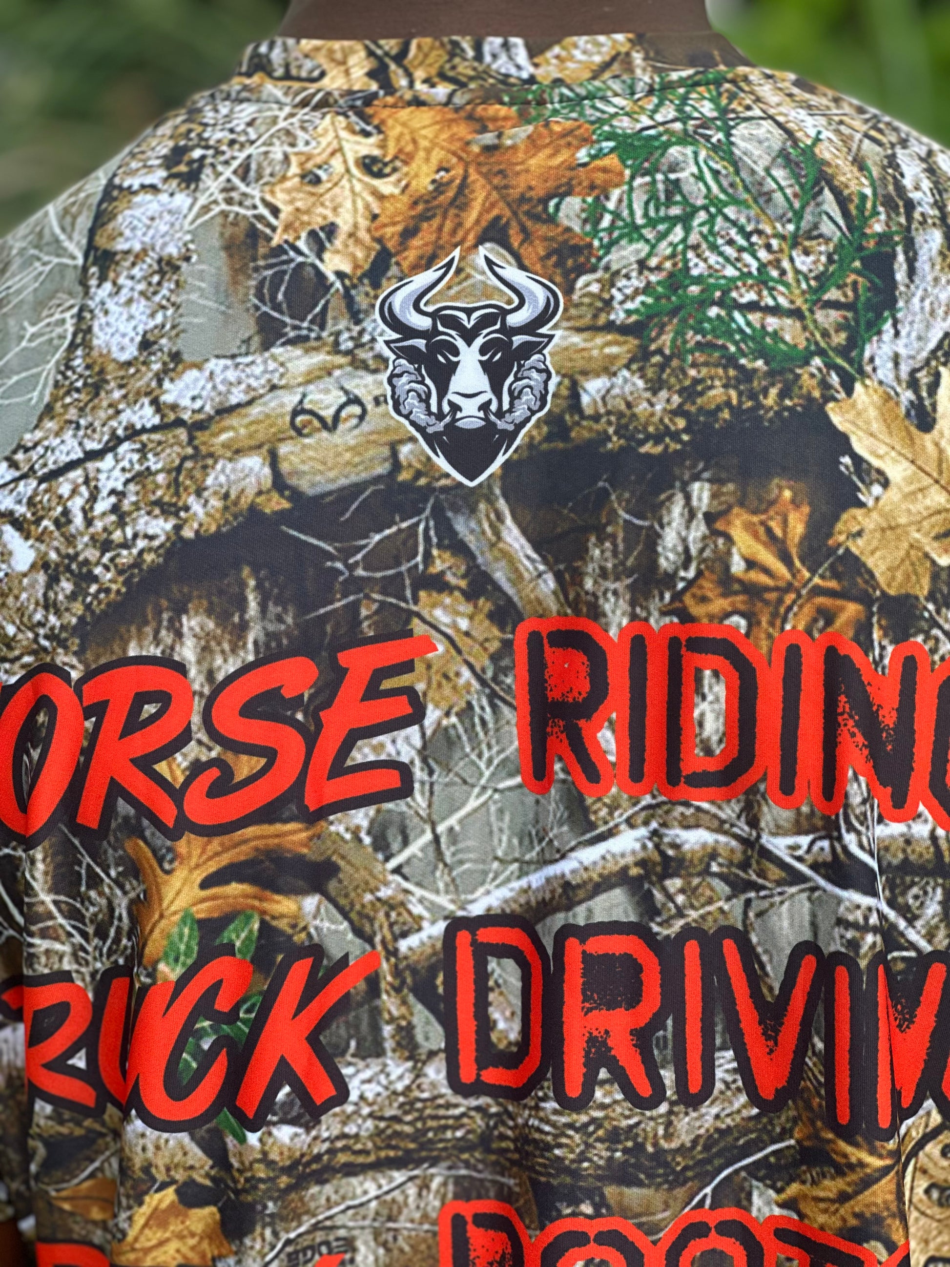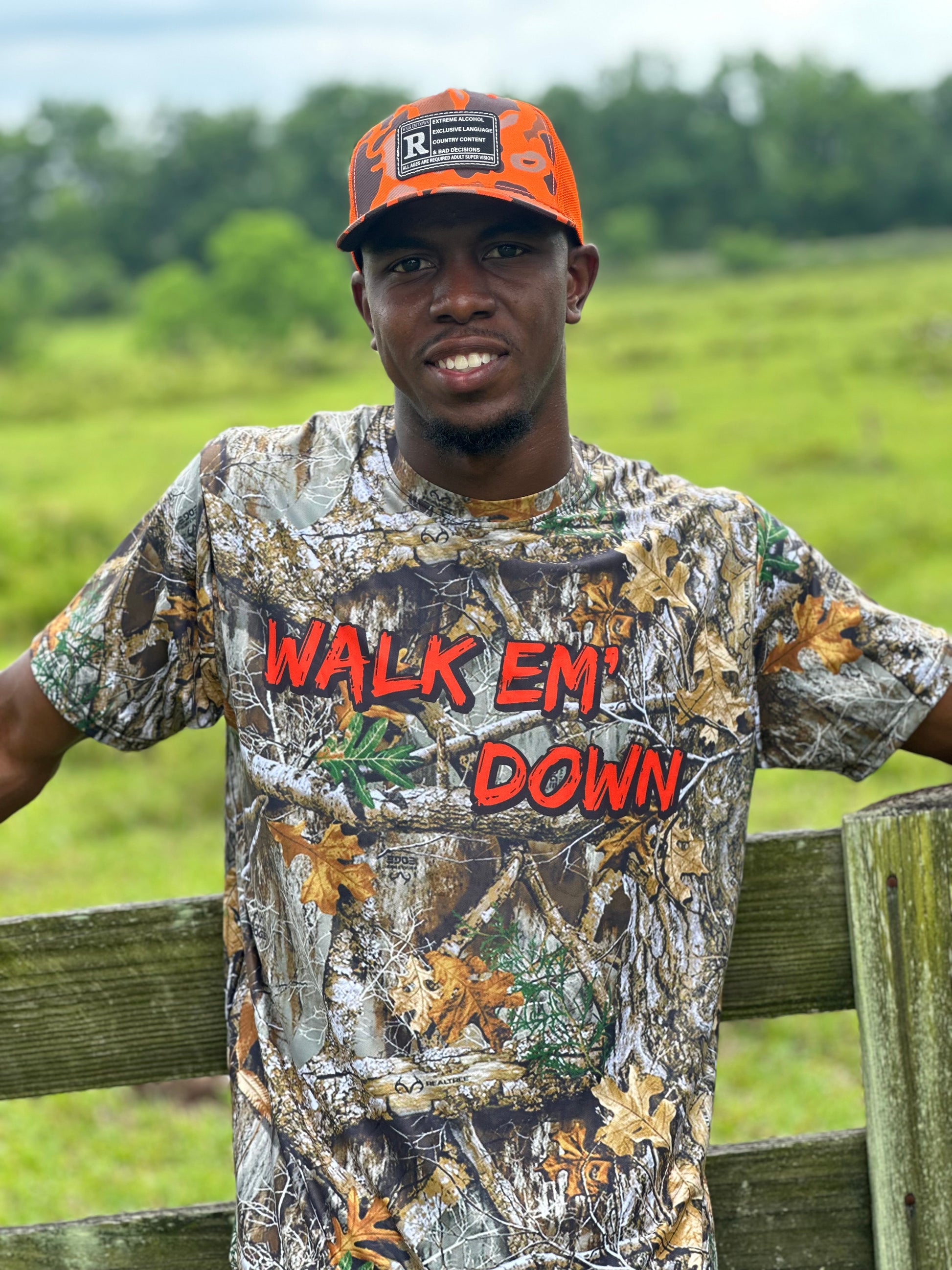 Camo Dri-Fit Short Sleeve Shirt with Orange & Black Writing